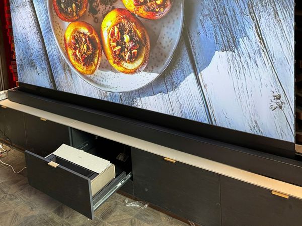 Ca setup lần này khá đặc biệt khi khách hàng muốn đặt chiếc Xgimi Aura 2 vào ngăn tủ và màn chiếu để sàn quang học điện tự động sẽ được đặt ở phía trên mặt tủ, khi ấn nút bật lên, máy chiếu sẽ đẩy từ ngăn tủ ra, đồng thời màn chiếu cũng được bật kéo lên. Dạng tủ này được đội thiết kế tủ và Mắt thấy tai nghe kết hợp thực hiện cho ra sản phẩm có khả năng hoạt động mượt mà, chính xác và cực kỳ hiện đại, không chỉ chủ nhà mà bất kỳ vị khách nào đến chơi nhà cũng phải trầm trồ, chú ý đến từ sự thông minh của hệ thống cho đến chất lượng trình chiếu tuyệt vời của Xgimi Aura 2