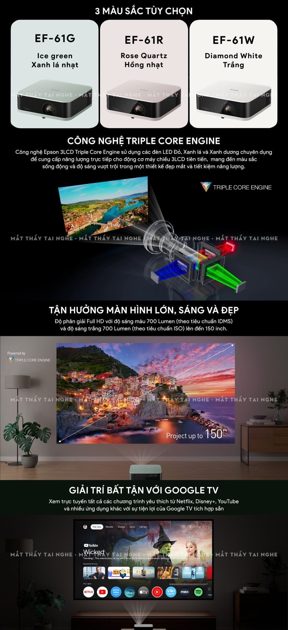 Epson EF-61 - Máy chiếu mini thông minh tích hợp Google TV, sử dụng công nghệ 3LCD độc quyền kết hợp nguồn sáng RGB-LED thế hệ mới, độ sáng 700 ISO lumens, độ phân giải chuẩn Full HD, tương phản 5.000.000:1 cho hình ảnh và màu sắc cực đẹp