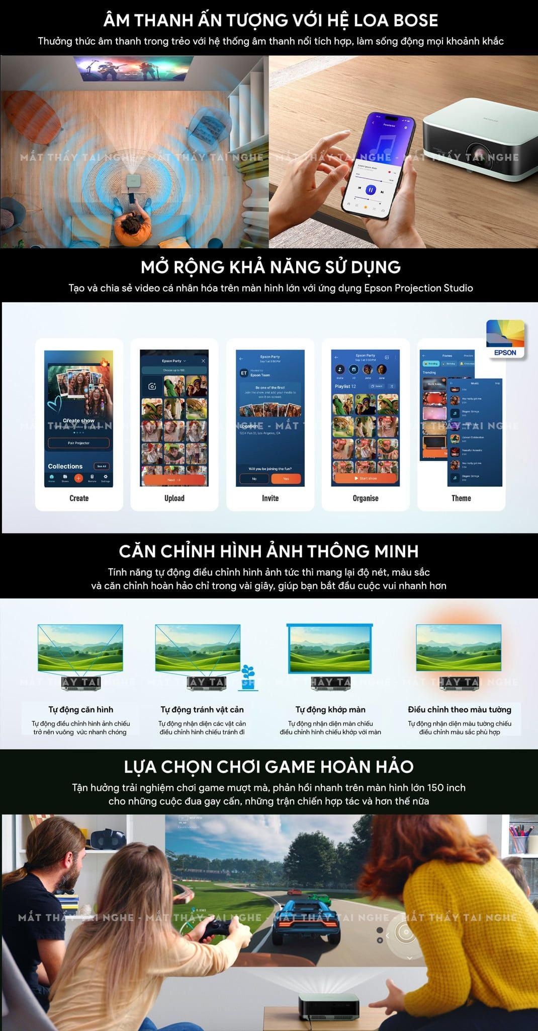 | Đặc điểm đặc biệt | Hỗ trợ Netflix chính chủ Khởi động nhanh chỉ 7.5 giây Frame Interpolation: nội suy chuyển động Scene Adaptive Gamma: điều chỉnh chất lượng hình ảnh Autofocus: tự động lấy nét Auto keystone: tự động chỉnh méo hình góc tối đa 20 độ Automatic obstacle avoidance: tự động nhận diện vật cản |