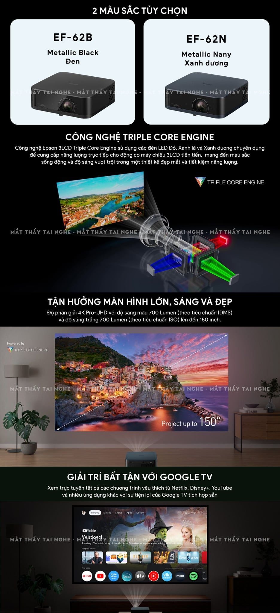 Epson EF-62 - Máy chiếu mini thông minh tích hợp Google TV, sử dụng công nghệ 3LCD độc quyền kết hợp nguồn sáng RGB-LED thế hệ mới, độ phân giải 4K PRO-UHD, độ sáng 700 ISO lumens, tương phản 5.000.000:1 cho hình ảnh và màu sắc cực đẹp