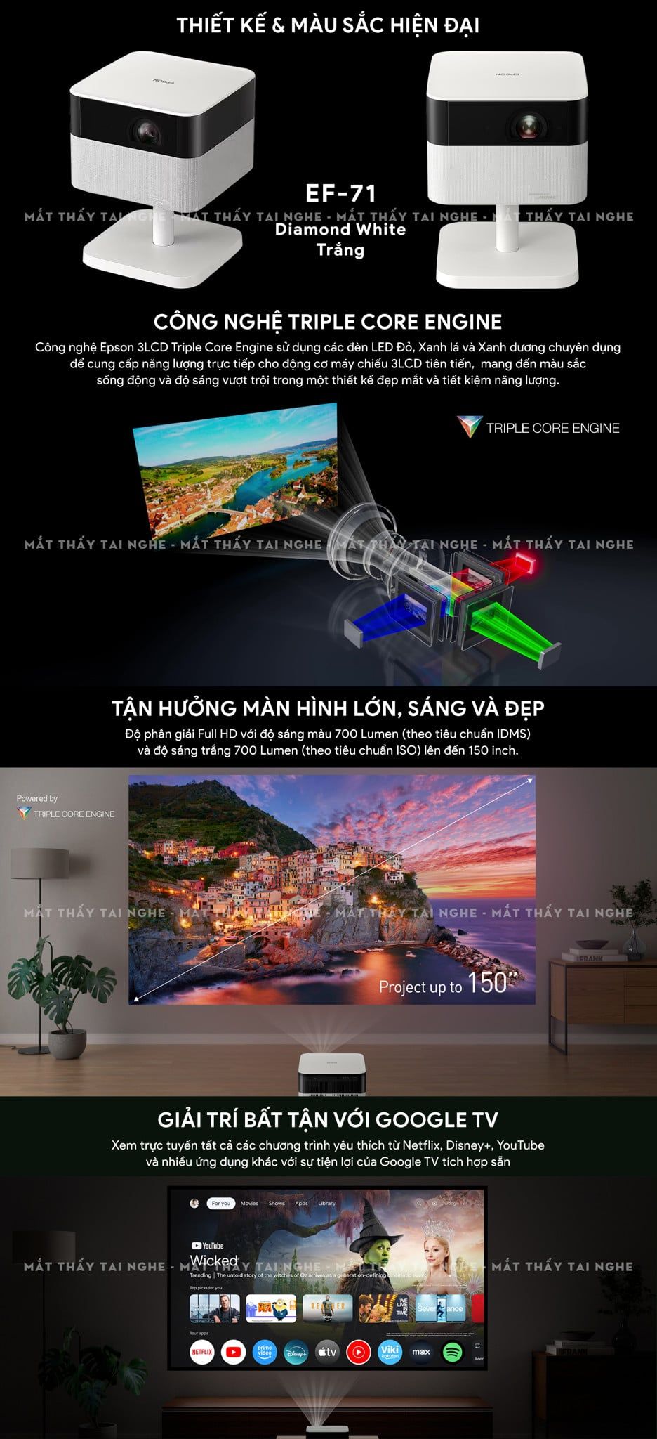 Epson EF-71 - Máy chiếu mini thông minh tích hợp Google TV, sử dụng công nghệ 3LCD độc quyền kết hợp nguồn sáng RGB-LED tiên tiến, độ sáng 700 ISO lumens, độ phân giải chuẩn Full HD, tương phản 5.000.000:1 cho hình ảnh và màu sắc cực đẹp