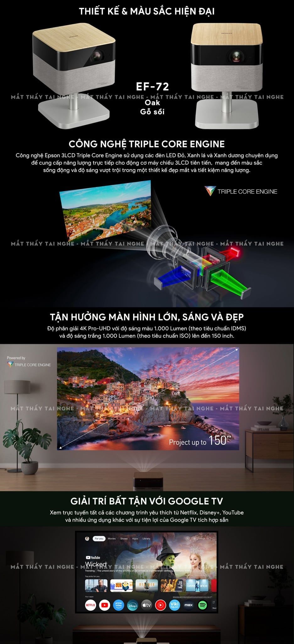 Epson EF-72 - Máy chiếu mini thông minh tích hợp Google TV, sử dụng công nghệ 3LCD độc quyền kết hợp nguồn sáng RGB-LED tiên tiến, độ phân giải 4K PRO-UHD, độ sáng 1.000 ISO lumens, tương phản 5.000.000:1 cho hình ảnh và màu sắc cực đẹp