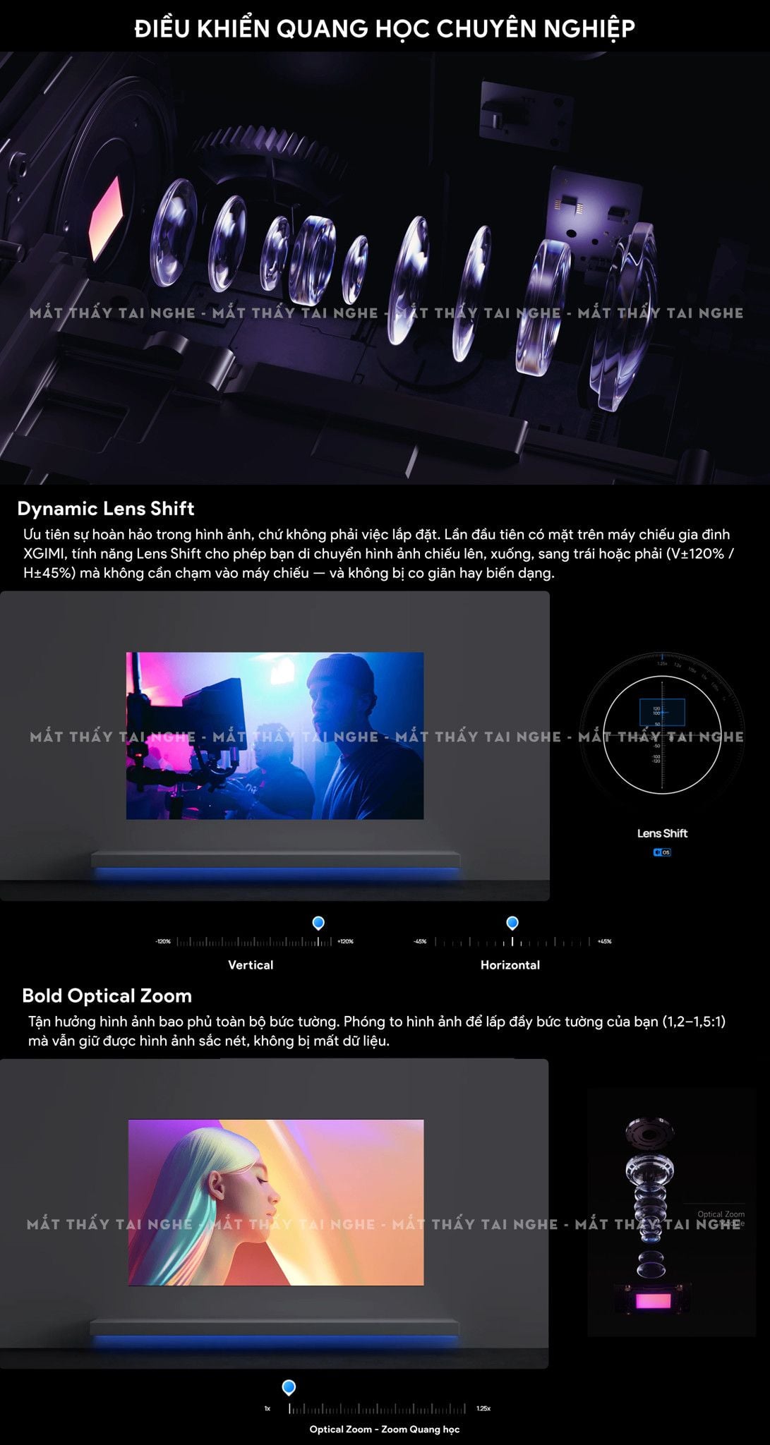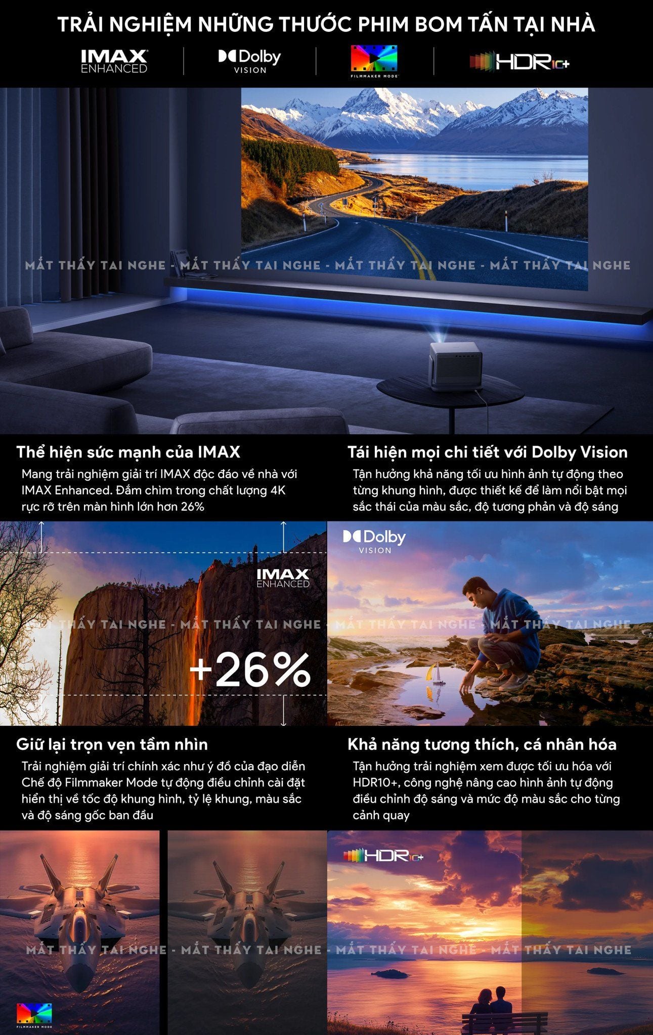 | Đặc điểm đặc biệt | Công nghệ RGB Triple Laser Chứng nhận IMAX Enhanced Chứng nhận Dolby Vision Chứng nhận SGS ΔE<0.8 Tích hợp chân gimbal xoay linh hoạt Hỗ trợ Lens Shift V±120%/H±45% Hỗ trợ Zoom Quang học và Zoom Kỹ thuật số ISA 5.0 Uninterrupted Auto Keystone: tự động chỉnh méo hình không gián đoạn ISA 5.0 Auto Focus: tự động lấy nét ISA 5.0 Intelligent Screen Alignment: Tự động khớp khung hình màn chiếu ISA 5.0 Intelligent Obstacle Avoidance: Tự động nhận diện vật cản ISA 5.0 Intelligent Eye Protection: Bảo vệ mắt thông minh ISA 5.0 Wall Color Adaptation: Hiệu chỉnh màu sắc theo màu tường chiếu High Dynamic Range - HDR10+ Bù trừ chuyển động MEMC Dynamic Tone Mapping: Tối ưu hóa Ánh xạ tông màu động Game Mode 1ms Input Lag, up to 240Hz Variable Refresh Rate: tự động điều chỉnh tần số làm mới để đồng bộ với tốc độ khung hình (FPS) Hỗ trợ trình chiếu 3D |